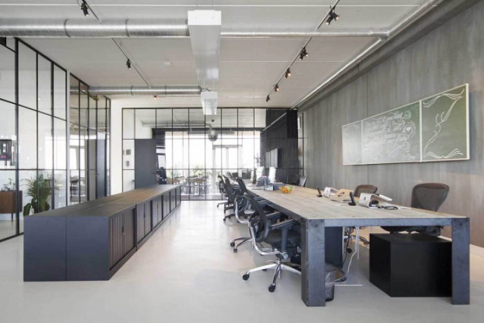 在办公室装修设计中,我们彻底打破传统办公的封闭与刻板,以裸露的混凝土梁柱、纵横交错的管线、原始的水泥墙面,构建出工业风最标志性的粗粝质感,让建筑的结构之美成为空间最震撼的装饰。大面积落地玻璃窗引入充沛自然光,搭配做旧实木地板与清水混凝土地面的材质碰撞,在办公室装修中实现 “冷硬工业感” 与 “温润自然感” 的平衡,让空间通透开阔,充满呼吸感。