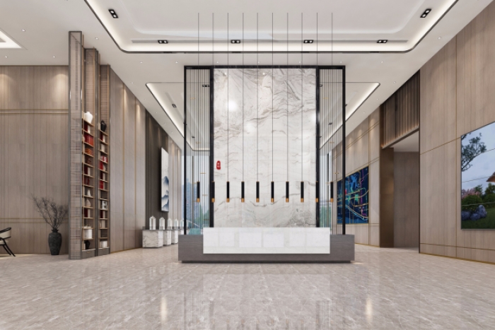 地面通铺大尺寸通体大理石瓷砖,纹理通透自然、耐磨防污、通透大气,适配大流量高端公区的长期耐用需求;全屋墙面大面积采用优质木饰面板,搭配精密无缝拼接、细腻封边打磨工艺,触感温润高级。