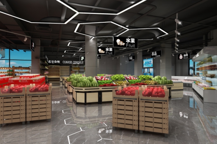 合肥装饰公司>合肥装修公司>办公室装修>厂房装修>展厅装修>办公楼设计装修 > 精品案例 > 精品店铺/餐饮店铺装修 > 芜湖3000平现代简约生鲜超市装修设计