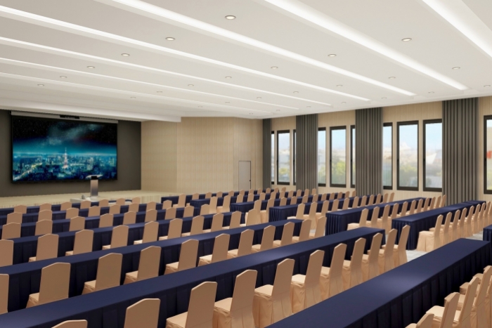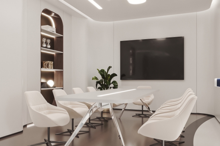 该会议室装修是一家渔具公司的会议室装修,该公司注重创新,希望通过会议室的设计传达出公司的品牌形象。设计师根据公司的需求和品牌特点,采用现代简约风格进行设计,同时融入科技元素,打造出一个兼具功能与美观的会议室。