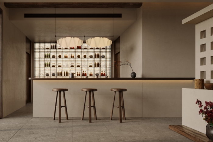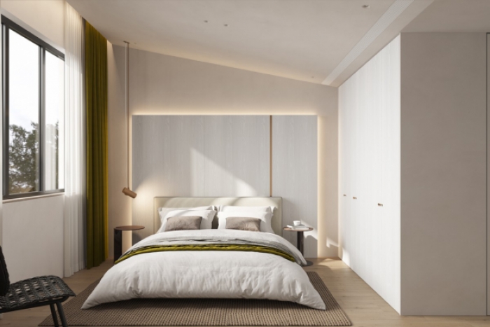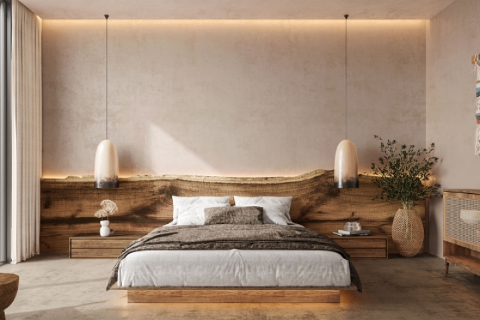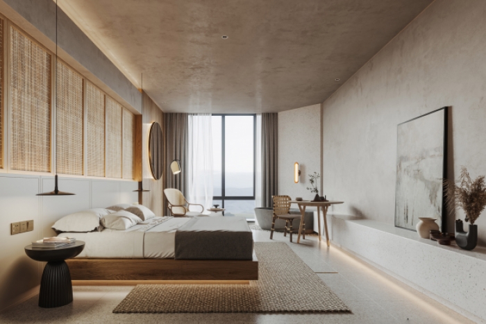 墙面采用肌理艺术涂料施工,细腻凹凸的哑光质感,环保透气、防潮防霉,适配潮湿山林环境,民宿长期使用不易掉粉老化,后期维护打理十分省心;大面积原木整板背景墙,严选实木板材,无多余修饰,自带沉稳静谧的东方韵味。